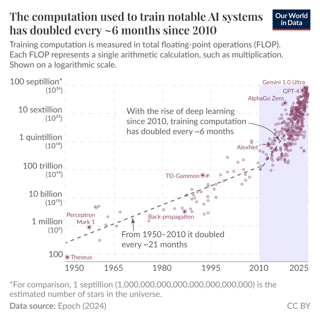 In November 2024, Nvidia’s CEO Jensen Huang claimed that we are now in an era of ‘Hyper-Moore’s Law’. Whilst this is no doubt an effort to drive up stock price, there is truth behind it. Instead of every two years, compute power is doubling every six months. The logarithmic graph below shows how rapid this development really is.